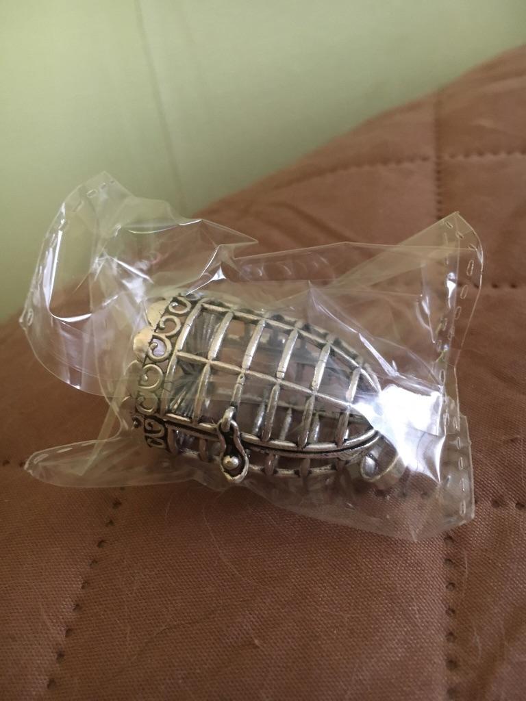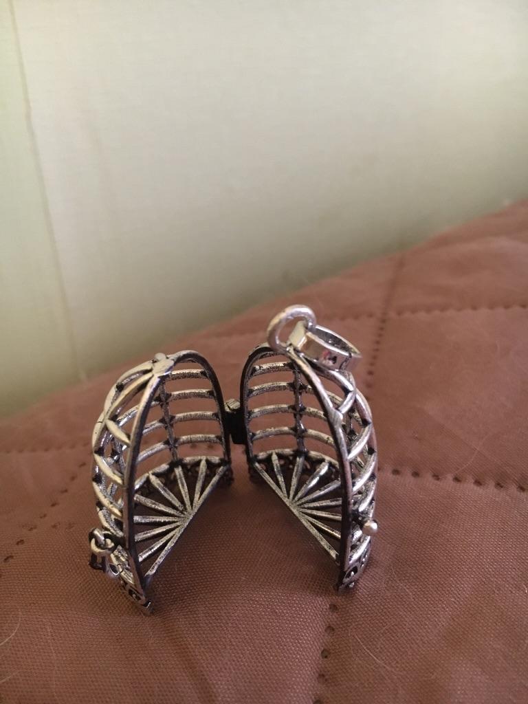 Embalado com cuidado. Chegou inteiro. Mas não consegui encontrar uma amostra, parece aço inoxidável. Grande demais para um pingente. Um lado cede. Não sei por que comprei...😕