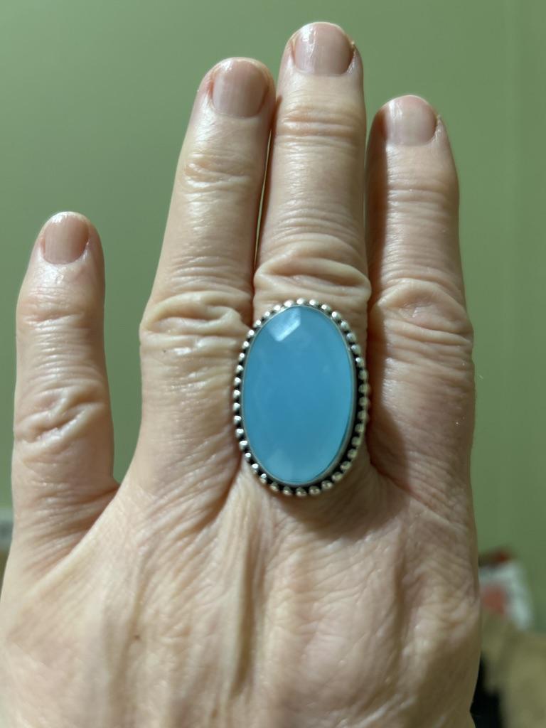 Joia de anel de promessa de prata esterlina 925 sólida com pedra preciosa de calcedônia azul feita à mão