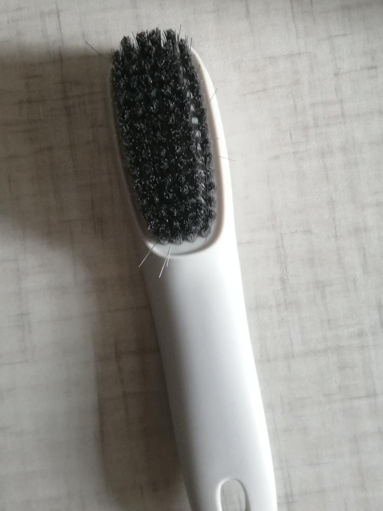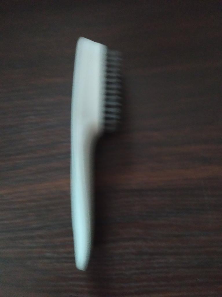 a aparência e a forma são boas. As cerdas são boas, rigidez média, exatamente o que é necessário para sapatos. O plástico do cabo é muito macio, no entanto (arranha facilmente, mesmo da embalagem em que veio).