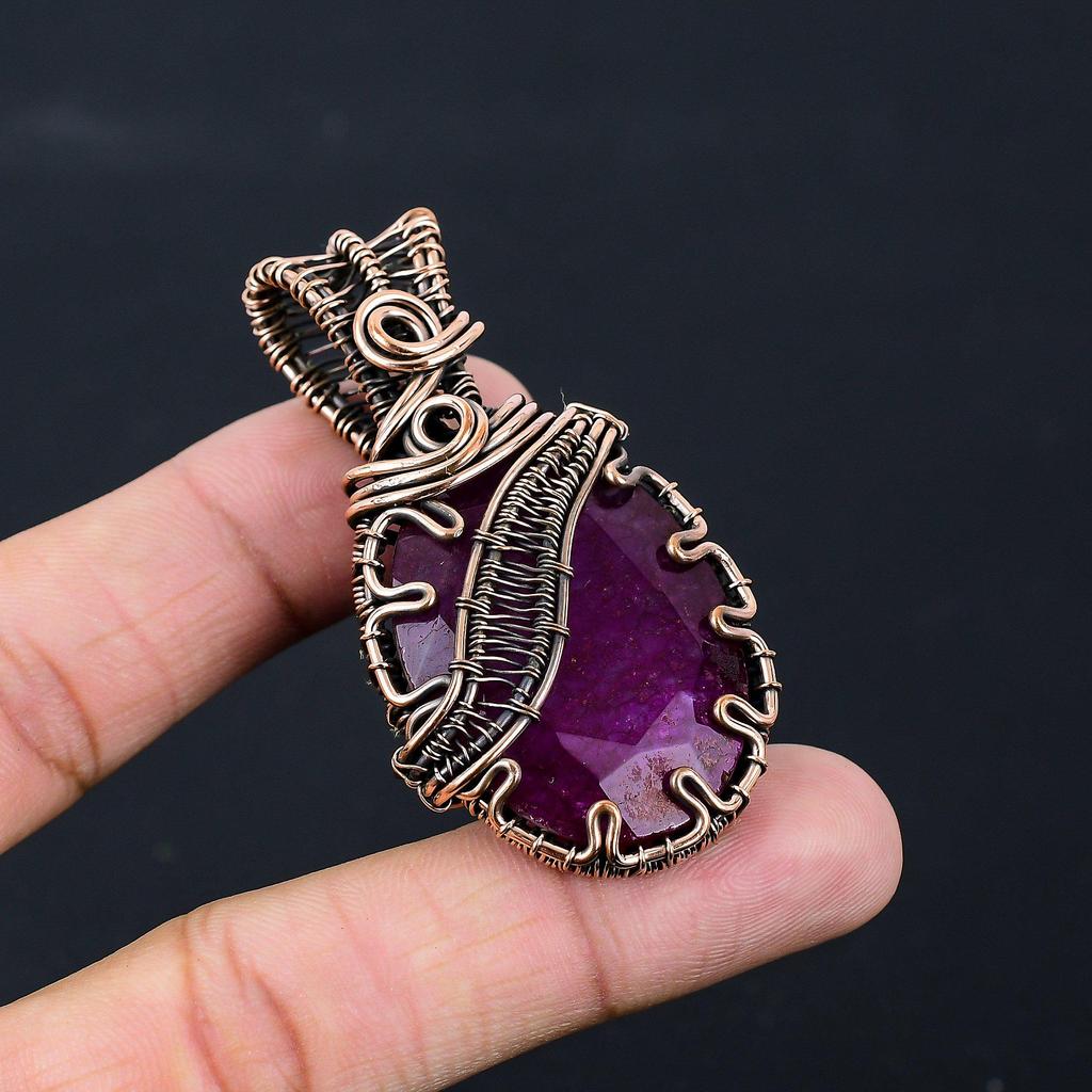 Pingente feito à mão com fio de cobre puro e pedra preciosa rubi criada em laboratório