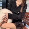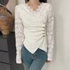 Camisa de renda bordada com decote em v de manga comprida feminina moda coreana magro plissado blusa vintage casual crochê elegante topos 30120