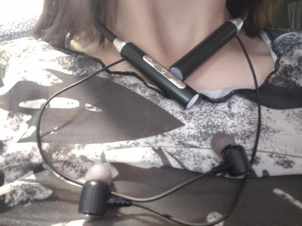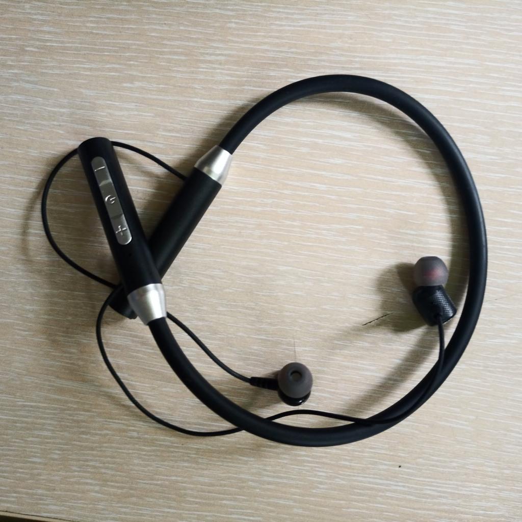 Fones de ouvido sem fio com fita para o pescoço. O conjunto inclui os próprios fones de ouvido com fita para o pescoço, cabo de carregamento e almofadas de silicone. O aro é de silicone, macio. Fácil de colocar, mantém-se bem. as extremidades são de plástico; Em um deles há um controle remoto em miniatura para diminuir o volume e ligar e desligar. Fios trançados de silicone com fones de ouvido estão presos a eles. Fones de ouvido com ímãs podem ser interligados. Toda essa estrutura cabe confortavelmente no pescoço e não voa. Parece-me que esta é a opção ideal para quem gosta de corrida e desporto em geral.. O telefone encontrou os fones de ouvido imediatamente. O som é excelente, claro. A carga mantém-se bem. Bem, o preço me deixa feliz!