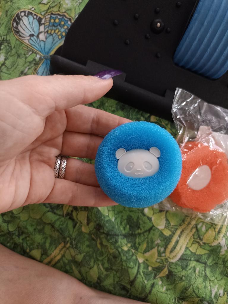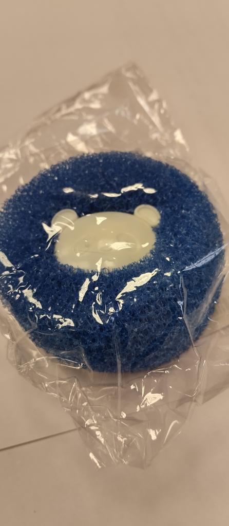 Igual a uma esponja comum, só que com um urso no centro. Talvez o cabelo fique acumulado na máquina de lavar durante a lavagem.