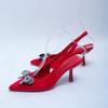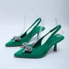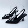 2024 Nova Moda Glitter Strass Mulheres Bombas Cristal Bowknot Seda Bico Fino Slip on Salto Alto Fino Festa Sapatos de Baile