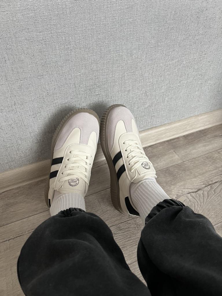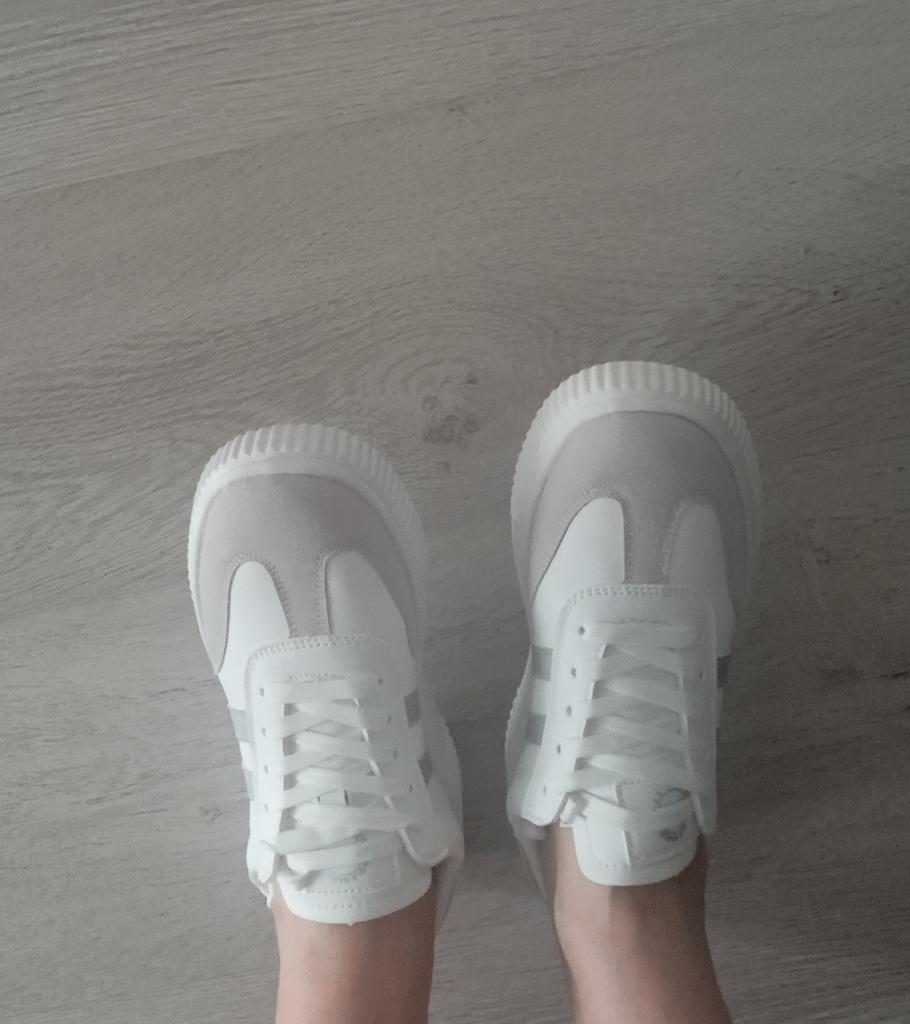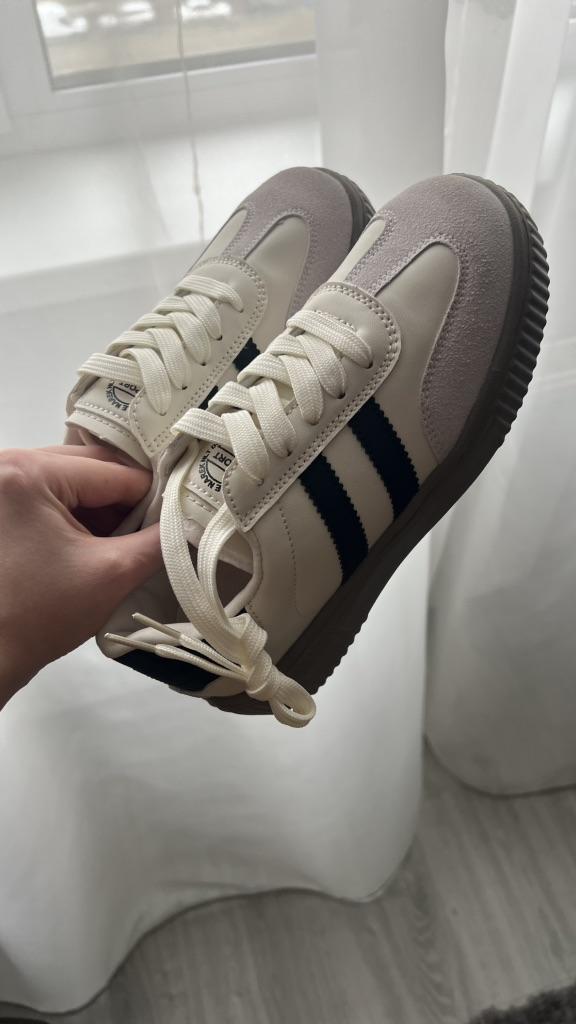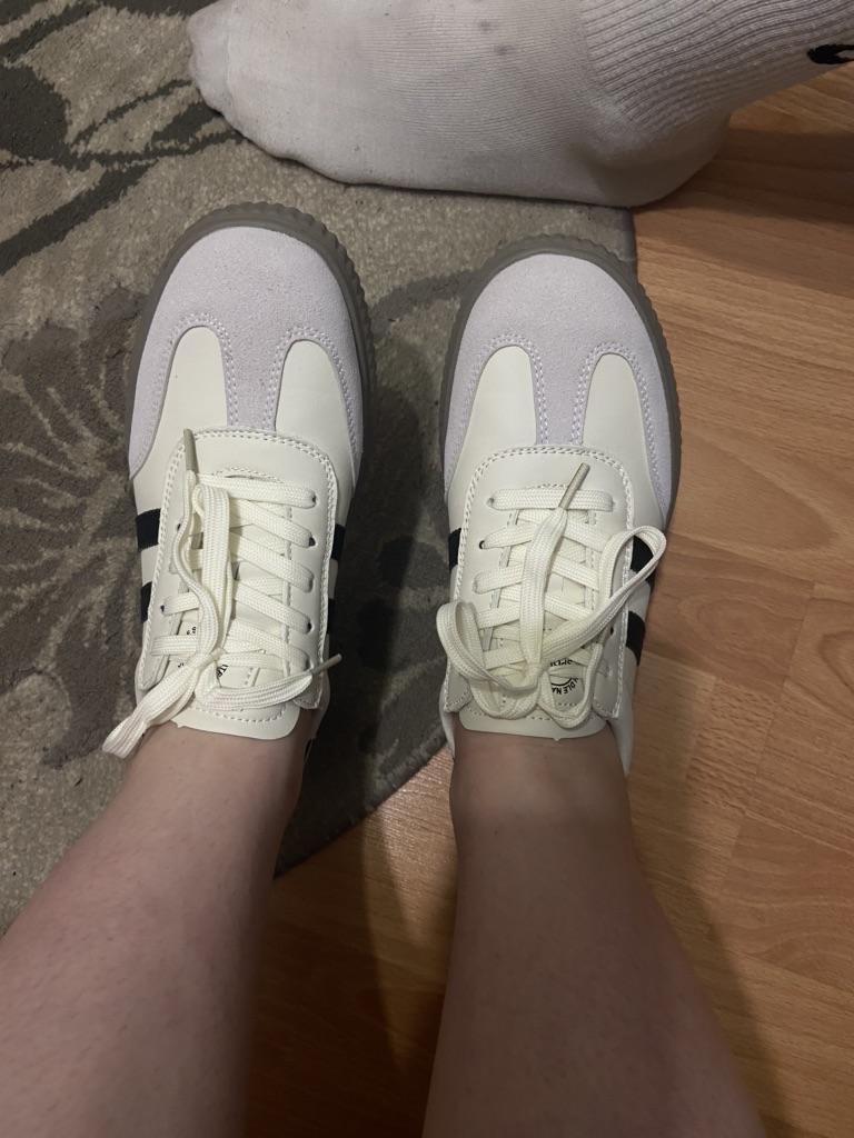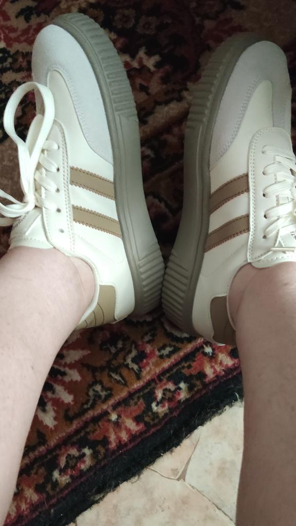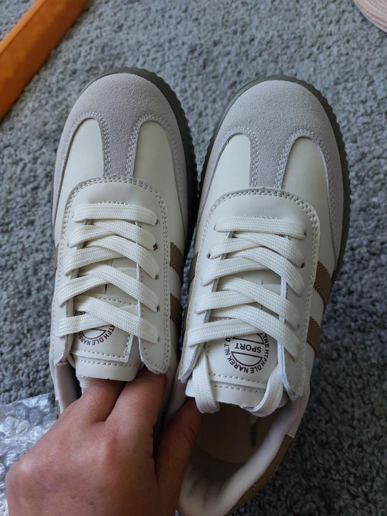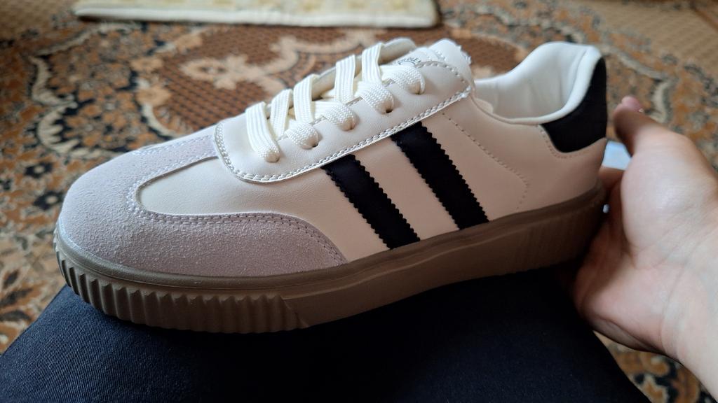 Tênis Algo no estilo do samba da Adidas 🤔 Eles parecem bem. Há uma inserção de camurça. A alfaiataria é boa. Não há cola visível. Há um cheiro. Das desvantagens, peguei o tamanho 38 para o meu pé de 23,5 cm. Resultado: dei para um amigo com tamanho de 40 pés😵💫. Quase certo para ele. Diz que são confortáveis, a sola é leve. Parece que a marca mudou para uma tabela de tamanhos diferente ou começou a fabricar tamanhos maiores