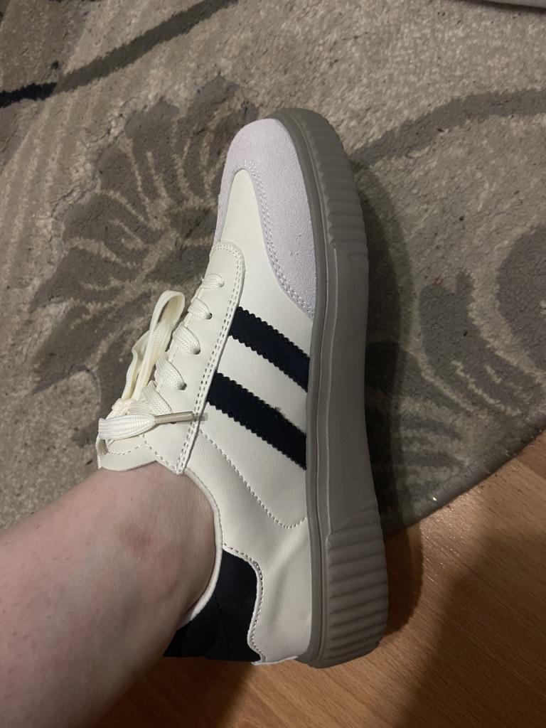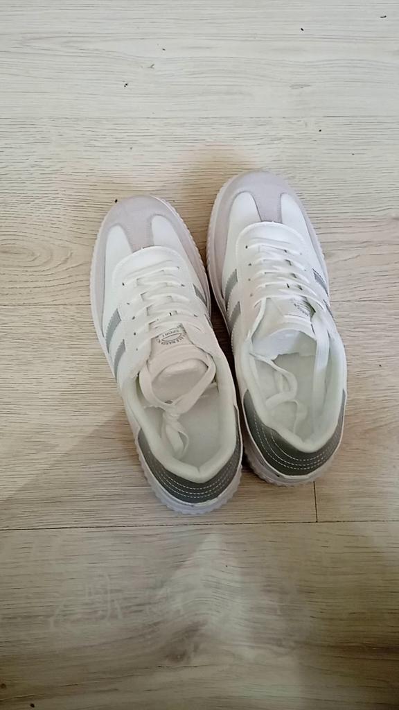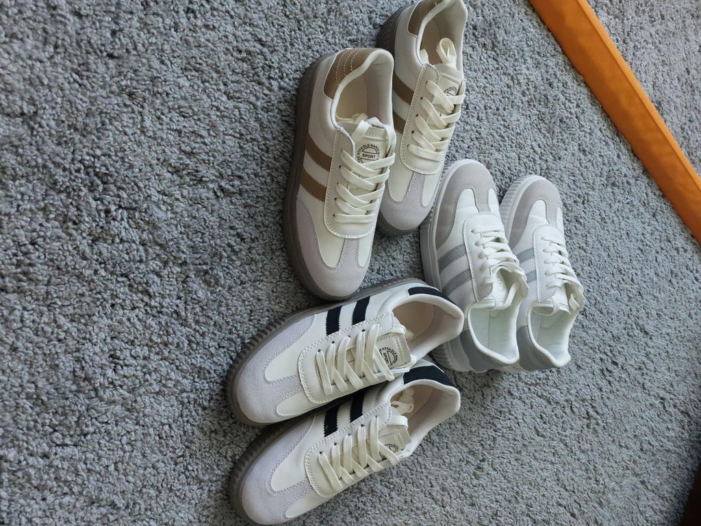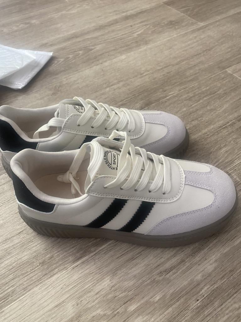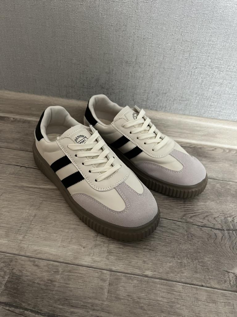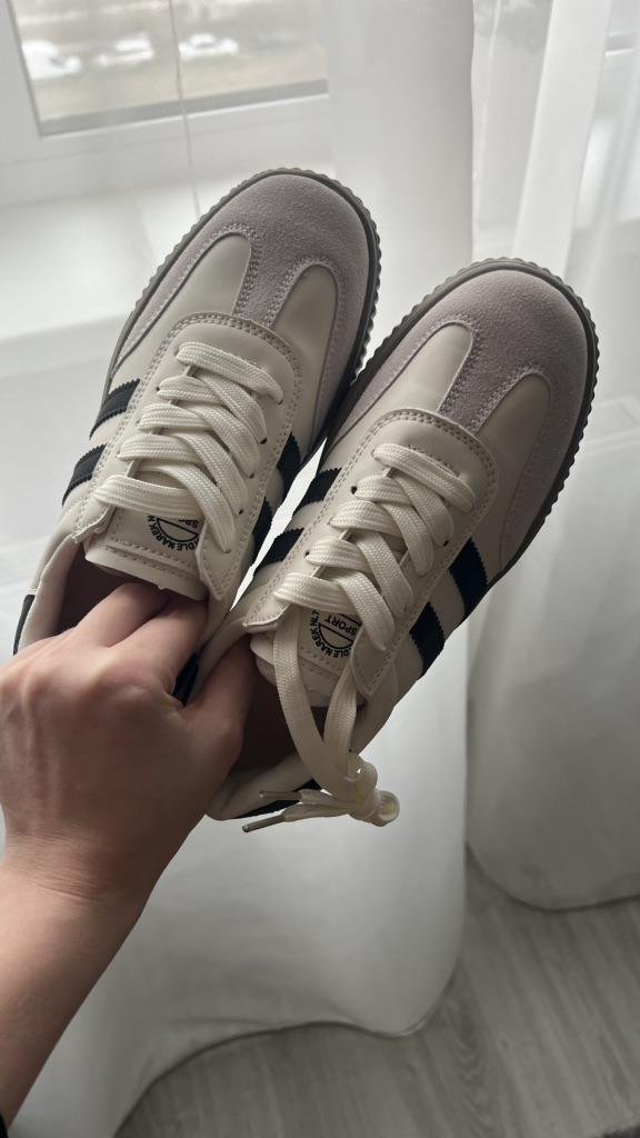 Tênis Algo no estilo do samba da Adidas 🤔 Eles parecem bem. Há uma inserção de camurça. A alfaiataria é boa. Não há cola visível. Há um cheiro. Das desvantagens, peguei o tamanho 38 para o meu pé de 23,5 cm. Resultado: dei para um amigo com tamanho de 40 pés😵💫. Quase certo para ele. Diz que são confortáveis, a sola é leve. Parece que a marca mudou para uma tabela de tamanhos diferente ou começou a fabricar tamanhos maiores