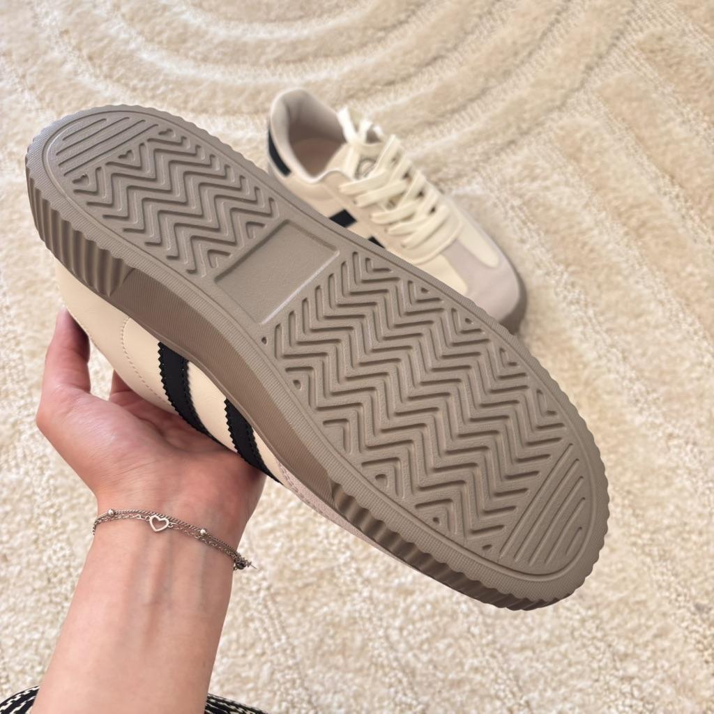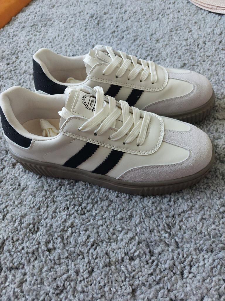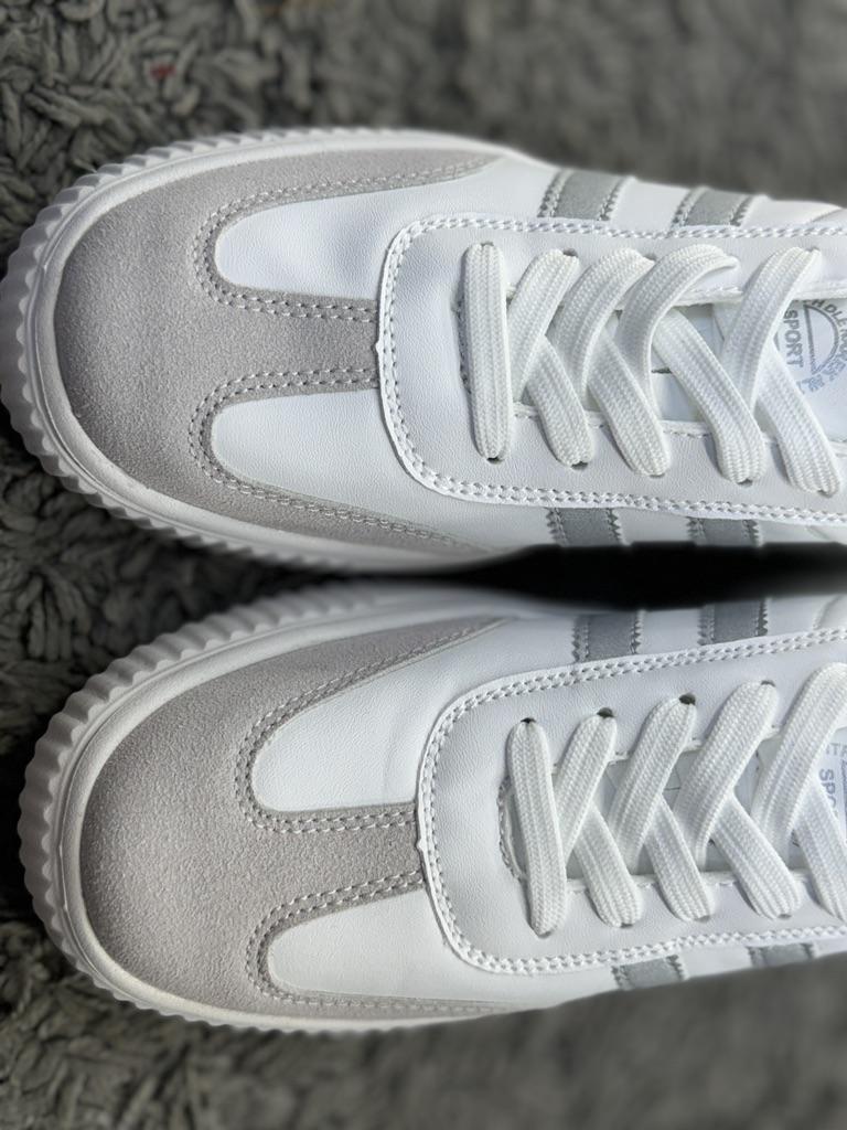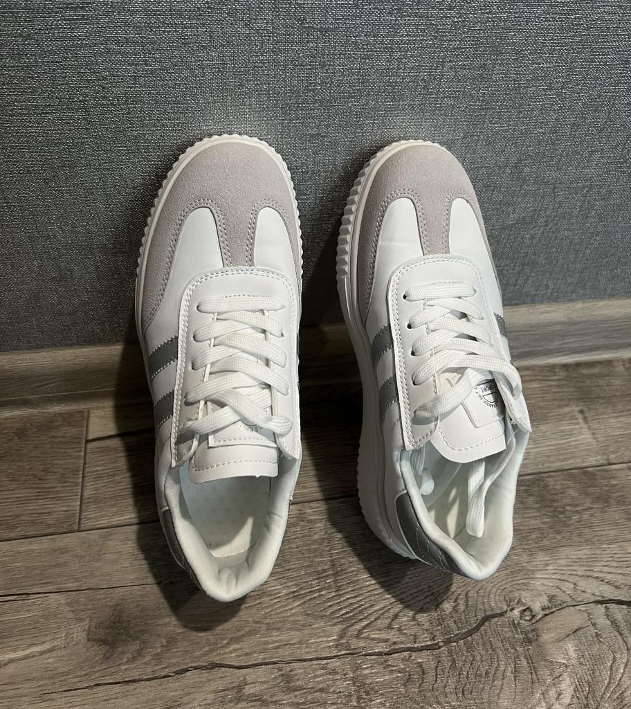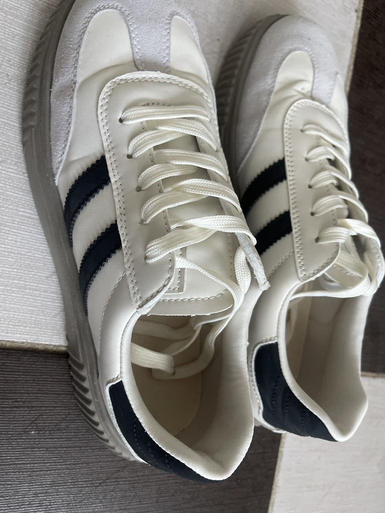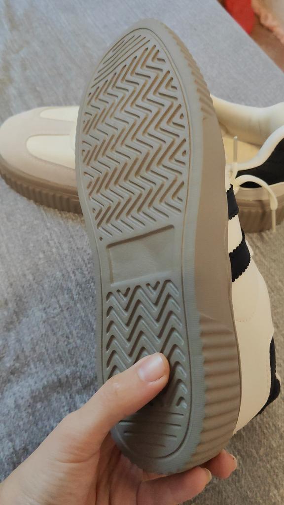 Tênis Algo no estilo do samba da Adidas 🤔 Eles parecem bem. Há uma inserção de camurça. A alfaiataria é boa. Não há cola visível. Há um cheiro. Das desvantagens, peguei o tamanho 38 para o meu pé de 23,5 cm. Resultado: dei para um amigo com tamanho de 40 pés😵💫. Quase certo para ele. Diz que são confortáveis, a sola é leve. Parece que a marca mudou para uma tabela de tamanhos diferente ou começou a fabricar tamanhos maiores