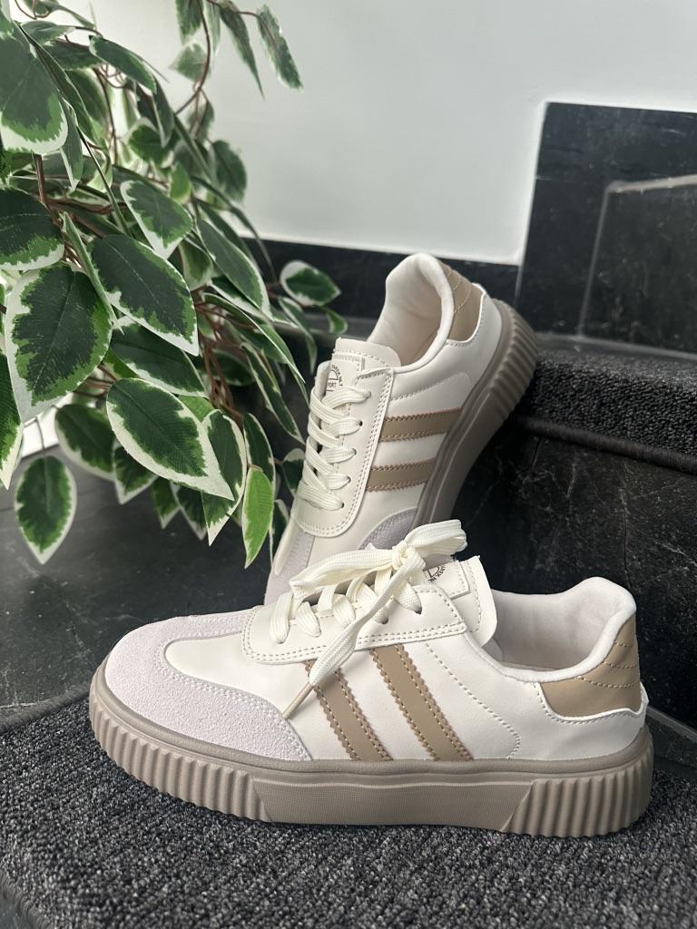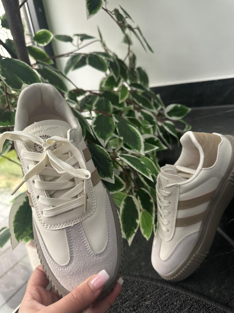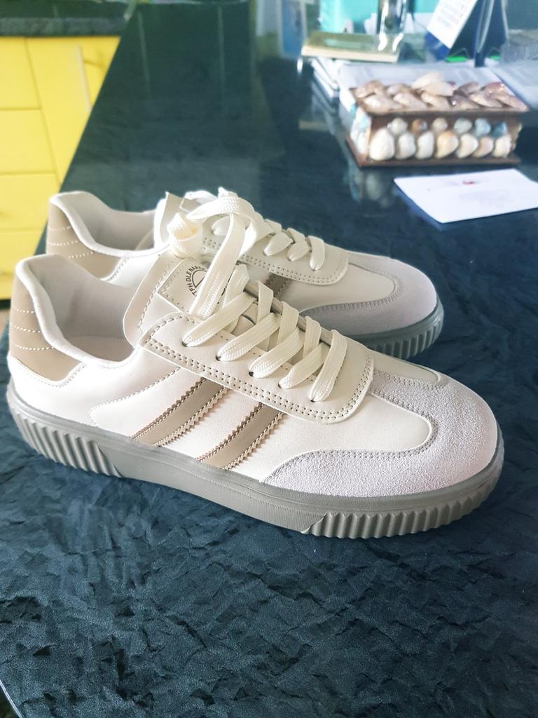 Tênis muito elegantes, dão para consertar mesmo sendo tênis Têm um toque muito elegante, são ideais para quando você quer estar um pouco mais arrumada mas acompanhando o conforto com o look realmente te faz sentir muito. bonito. Possui pequenos detalhes de linhas e tons mais escuros que valorizam o Tênis, e são ideais para combinar com qualquer coisa. A plataforma é pequena e muito confortável, por isso se nesse dia quiser ir um pouco mais rasteira, estes ténis são o que procura.. O tamanho é exatamente como o vendedor mostra seus tamanhos, Também chegou bem protegido com seus protetores internos para não se deformar durante o trajeto.