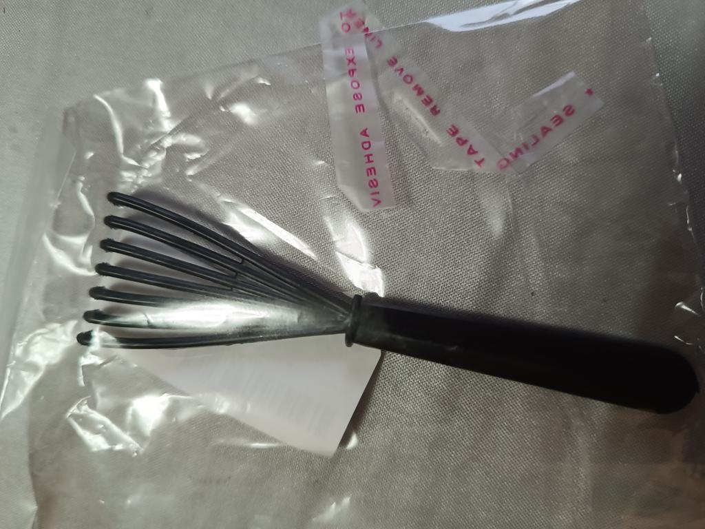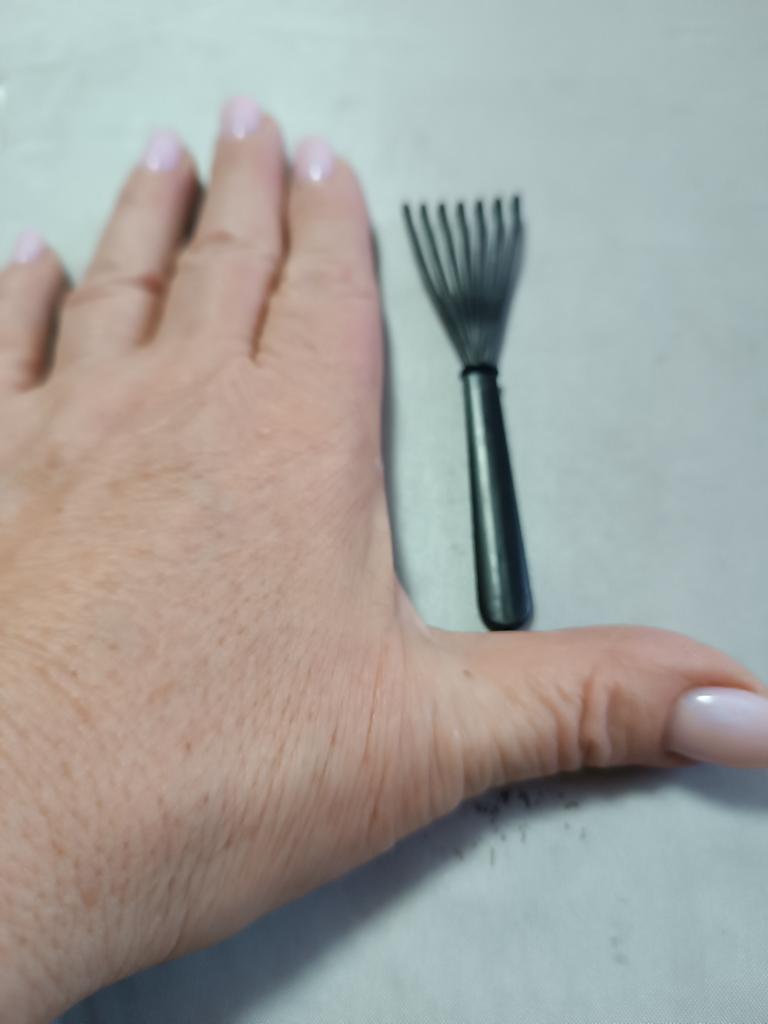 Bem pequenininha, de plástico. Eu peguei não para pentear, mas para mexer na terra dos vasos 😁 Em princípio, está bom. Resistente, tudo como anunciado.