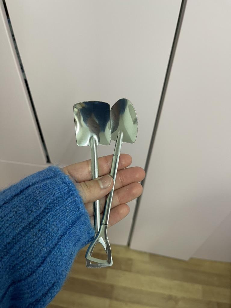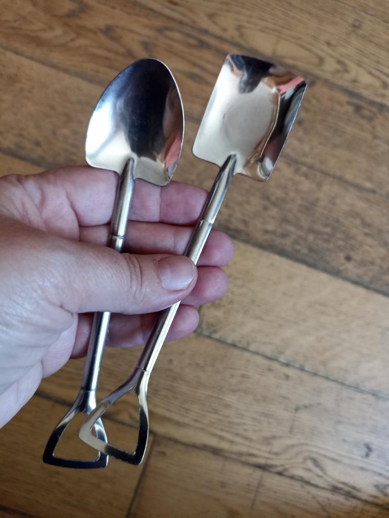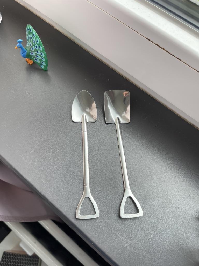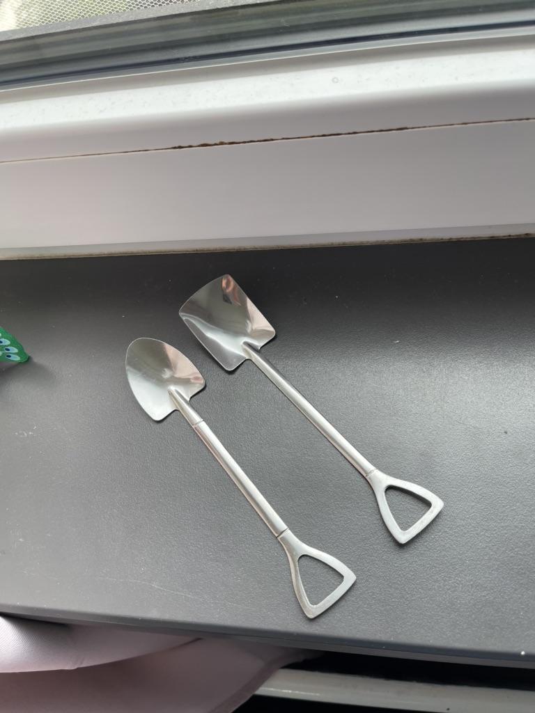 colheres de chá Eu vi essas colheres incomuns e resolvi encomendá-las. O vendedor tem variações diferentes, escolhi um conjunto de duas colheres: duas "pás" diferentes😅 Aliás, muito confortável. O material é bom, depois de lavar na máquina de lavar louça ficaram como estavam no início, não saiu nada.