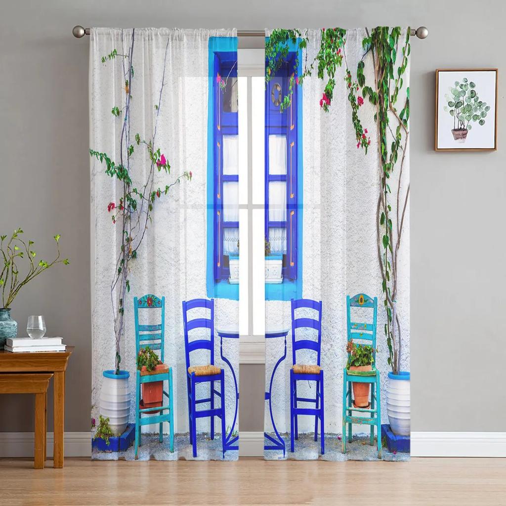 Street Bistro Windows Cadeiras Cortinas de tule Varanda Sala Moda Cortina transparente impressa Sala de estar Janela Decoração moderna