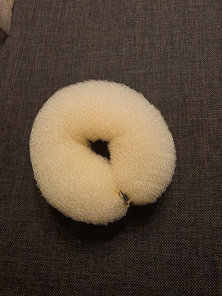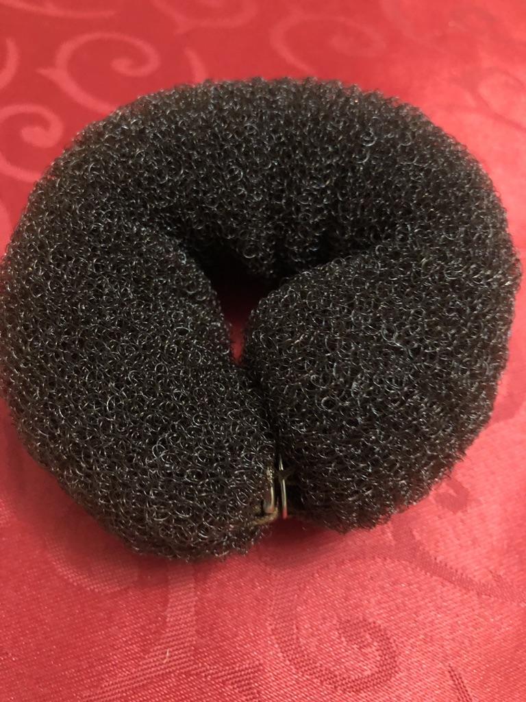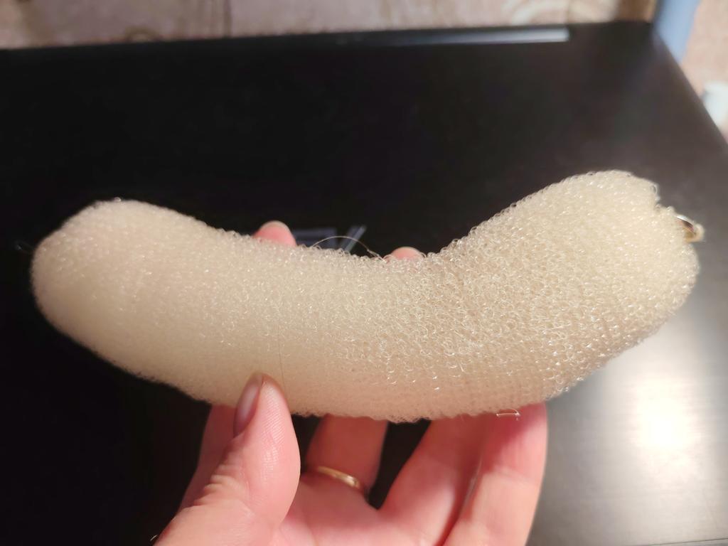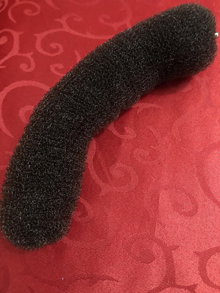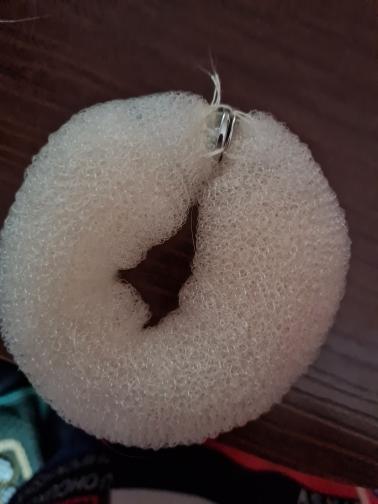 Pedaço de espuma com fechos de botão grosseiramente costurados. Não se segura muito bem no cabelo.