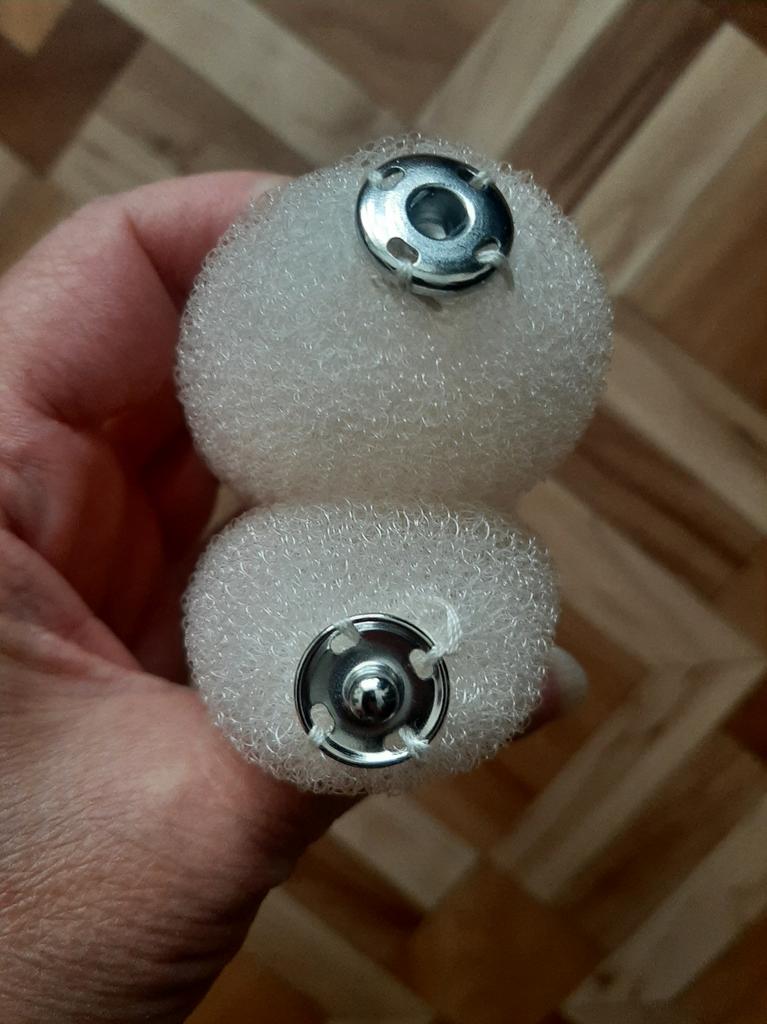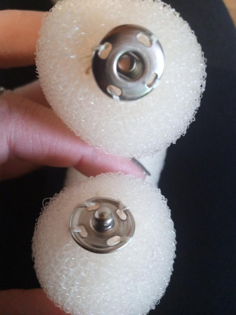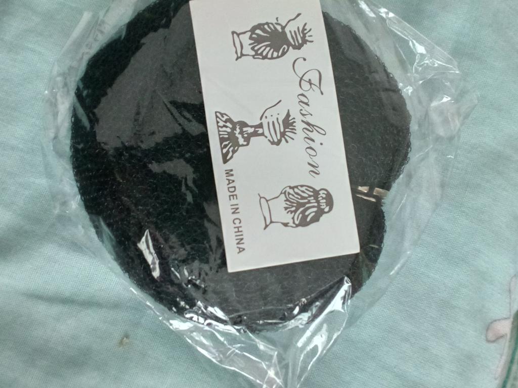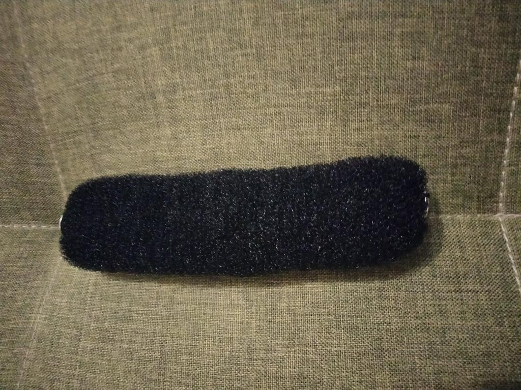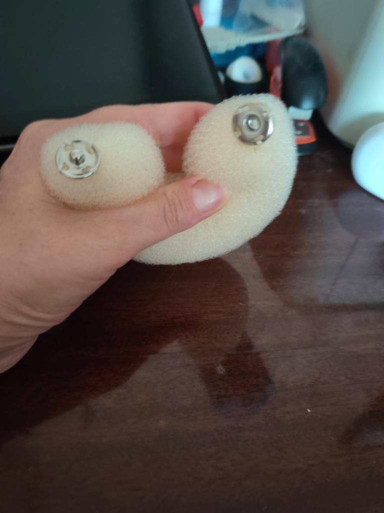 Pedaço de espuma com fechos de botão grosseiramente costurados. Não se segura muito bem no cabelo.