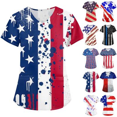 Moda feminina Dia da Independência Impresso Manga Curta Decote em V Padrão Tops Bolso Camisetas de Trabalho