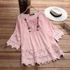 Blusa feminina de verão, blusa de algodão e linho, plus size, renda, patchwork, elegante, amarrar, decote em V, folgada, blusa feminina