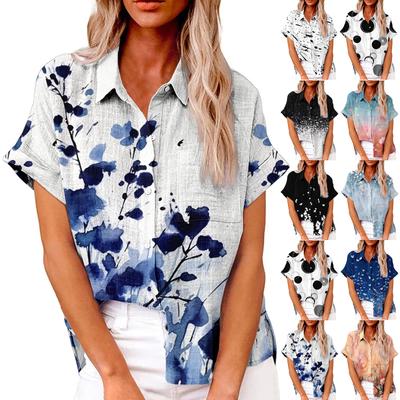 Moda feminina casual lapela manga curta impressão camisa feminina botão para cima tops
