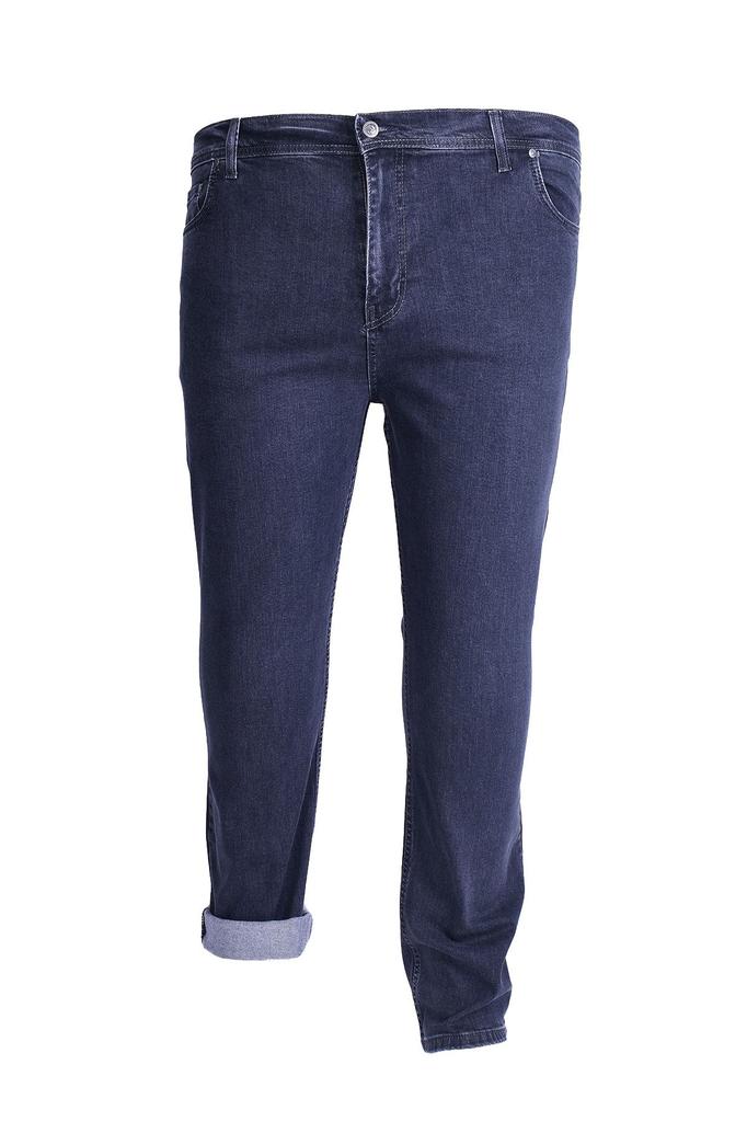 Calças azuis de tamanho grande são feitas de Lycra. O tamanho do modelo é 58. Lavagem - Tecido Pedra Liva.