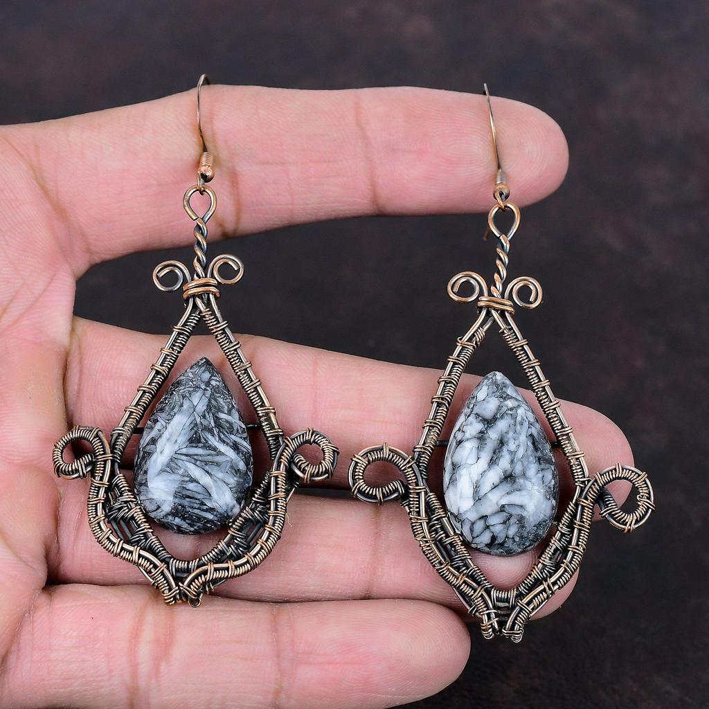 Brinco Pinolith Jasper Brincos Enrolados em Fio de Cobre Joias com Pedras Preciosas Brinco Elegante Feito à Mão Pinolith Jasper Joias de Cobre Presente de Casamento