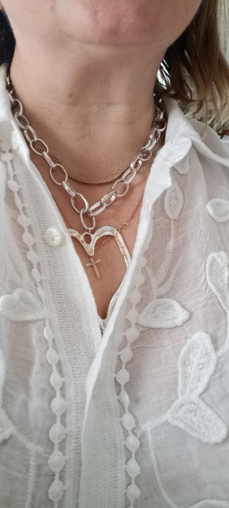 O colar parece muito bonito. A corrente é muito leve e não sei se é de metal, espero que a cor prateada não desapareça.