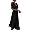 Apresentando uma manga voadora moderna e um estilo chique sem costas com decote em V, este vestido exala elegância e charme. Combine-o com seus acessórios favoritos, como colares, pulseiras e brincos, junto com uma bolsa de tecido ou sandálias para um conjunto completo..