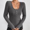 IHUASU Camiseta feminina de manga comprida com decote redondo e listras finas, cor sólida e botões patchwork