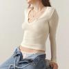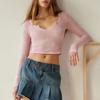 GMXIA Summer Women's Solid Color Ribbed Slim T-shirt V Neck Long Sleeve Knit Spice Girl Top