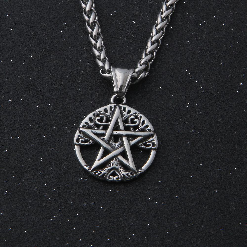 Attributes: Style: Viking Mystic, Material: Stainless Steel, Feature: Combined Tree of Life & Pentagram, Ancient Norse Symbolism, Protective Amulet, Durable Steel Construction, Retro Aesthetic.