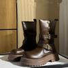 Botas Femininas de Couro Fosco com Sola Grossa Novo Outono Gola Estilo Retrô Britânico Antiderrapante Fivela de Cinto Botas Curtas Botas Amarelas