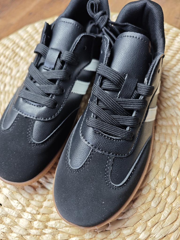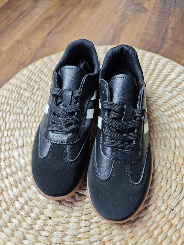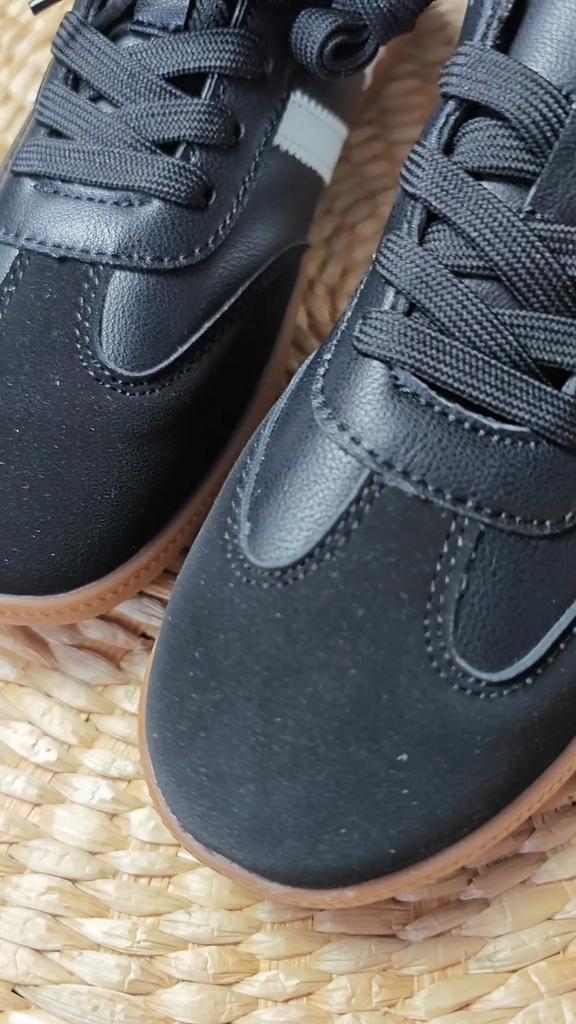 Ténis da moda em estilo retro Desta vez na cor preta. Gosto muito de como eles ficam exatamente em preto! Não é chamativo, ao mesmo tempo que a cor não é berrante e é universal.. Couro sintético combinado com camurça sintética, materiais e sola de qualidade razoável. Já consegui lavar na máquina, aguentaram a lavagem muito bem.. Calçam 1 número a menos: para o meu 37, encomendei o 38, ficou perfeito. As costuras são fortes e bem feitas, duram mais de uma estação.