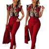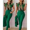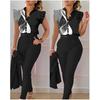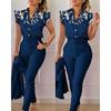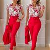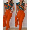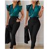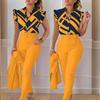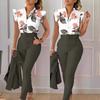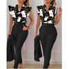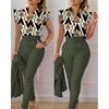 Conjunto de duas peças feminino elegante, moda, estampado, mangas bufantes, top, calças de cor sólida, conjunto com cinto, blusas, roupas femininas