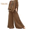 2 Pçs/set Mulheres Top Calças Conjunto Gola Redonda Retro Mangas Compridas Blusa Perna Larga Cintura Elástica Calças Diário Lazer Solto Roupa
