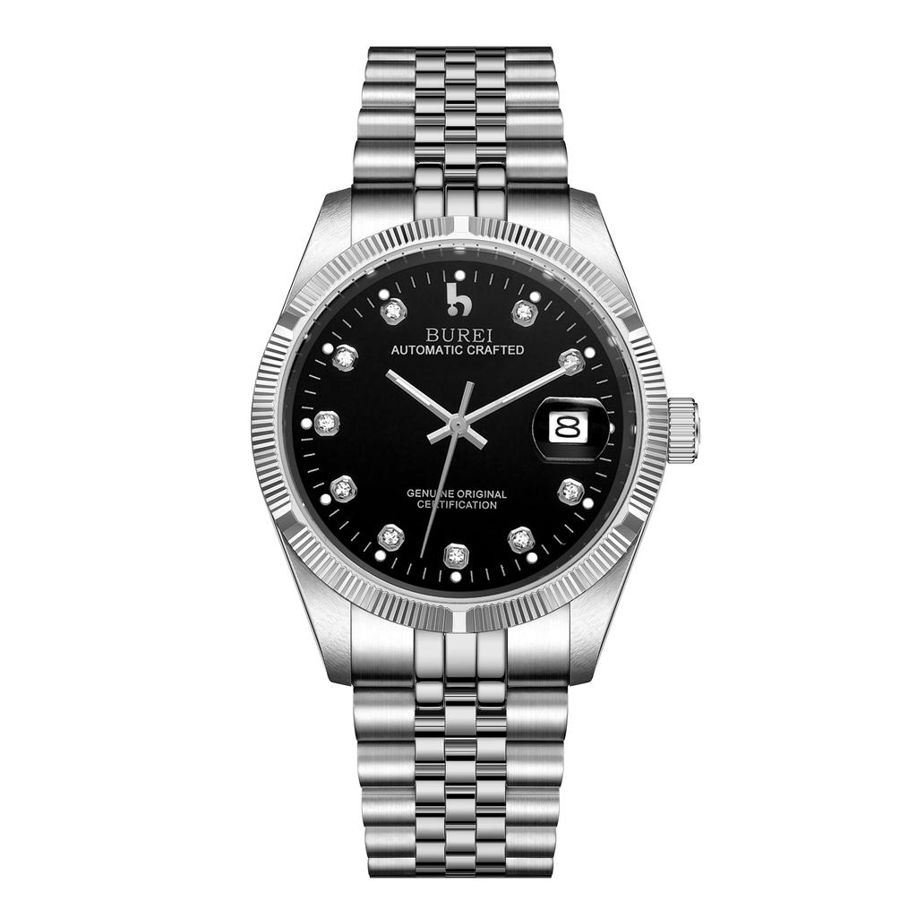 Relógio mecânico automático popular de braço prateado preto [BUREI] Relógio masculino, à prova d'água, analógico, data, relógio, marca masculina, elegante, relógio, simples, casual,