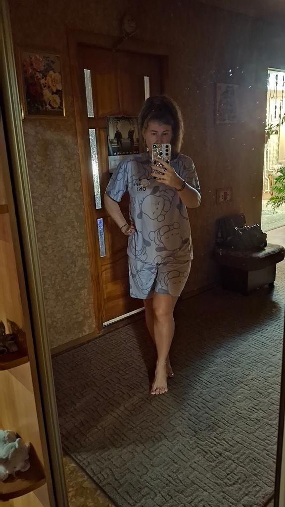 Conjunto de pijama feminino de verão 2024: Manga curta, caimento solto, gola redonda, duas peças com shorts