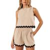 Women's Summer Two-piece Linen Lace Edge Crew-neck Vest Top Shorts