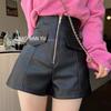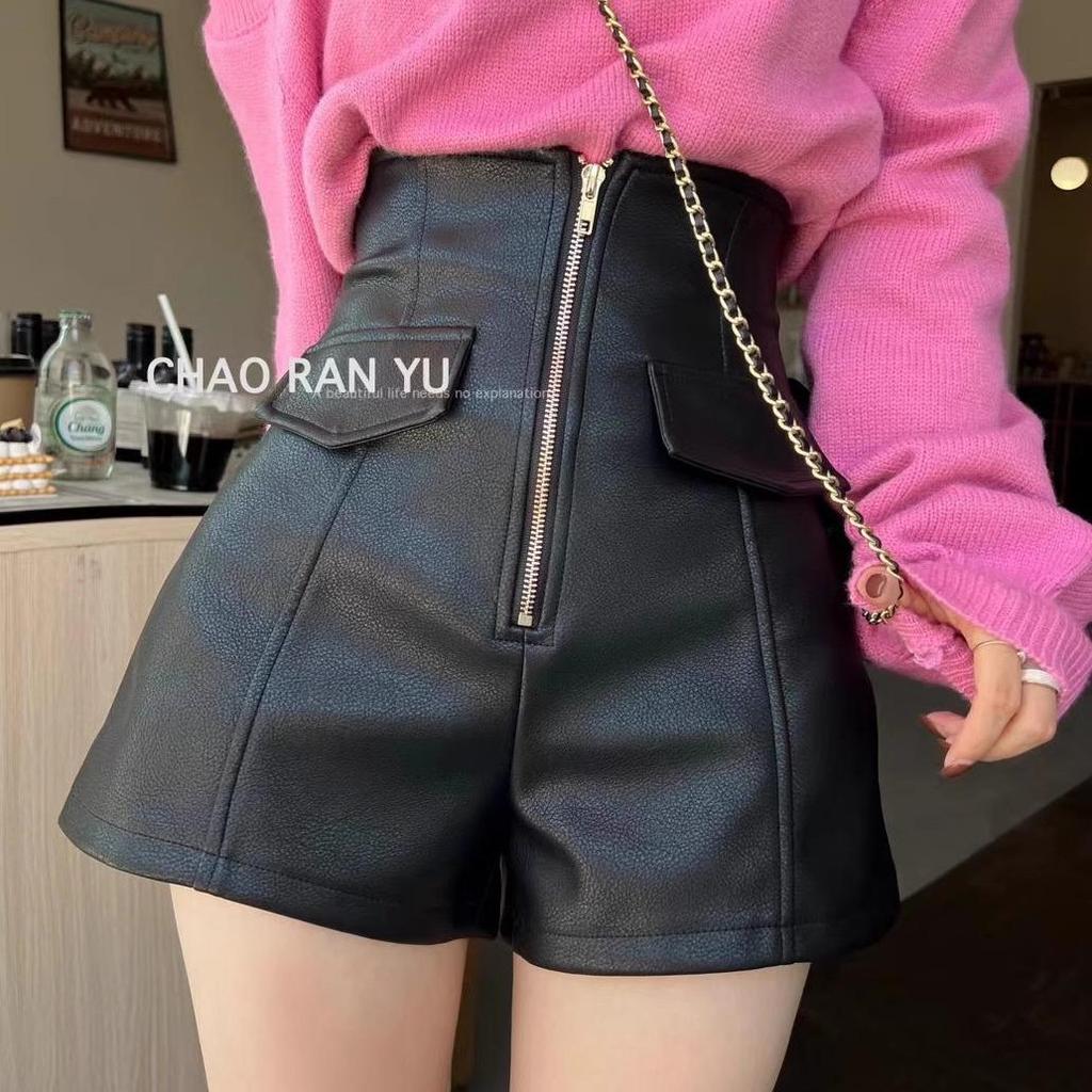 Women's High-Waist PU Leather Shorts, Autumn/Winter, Slim A-Line Wide-Leg Pants, Korean Style with Zipper.
