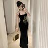Women's Sexy Cross-Strap Flower Embroidered Velvet Dress