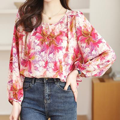 Tops femininos soltos manga comprida chiffon camisa floral