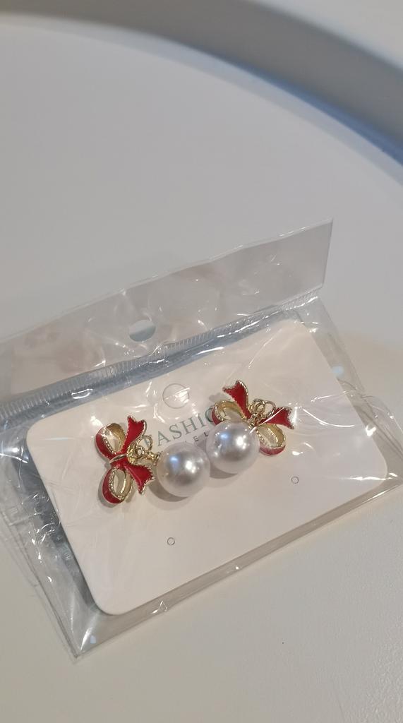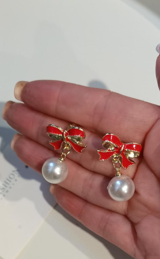 precioso 😍 Um laço vermelho 🎀 com uma pérola 🦪 pendurada que se move com o movimento 👌 Eles parecem muito elegantes ❤️ Eles parecem ótimos 💥 Eles têm uma apresentação muito bonita 😊 caso você escolha um presente 🎁 Embalagem correta 📦 Envio rápido ✈️ 100% recomendado 💯