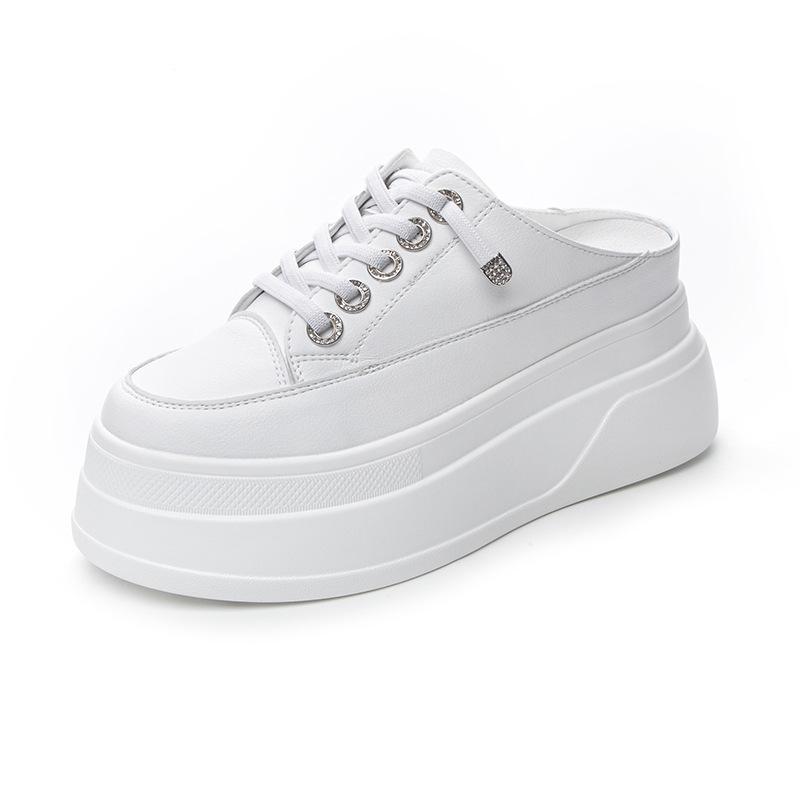 Meias-Pantufas Couro Genuíno Sapatos Casuais Femininos Plataforma Pantufas Femininas Cadarço Sapato Salto Branco Cano Baixo Calçado Feminino