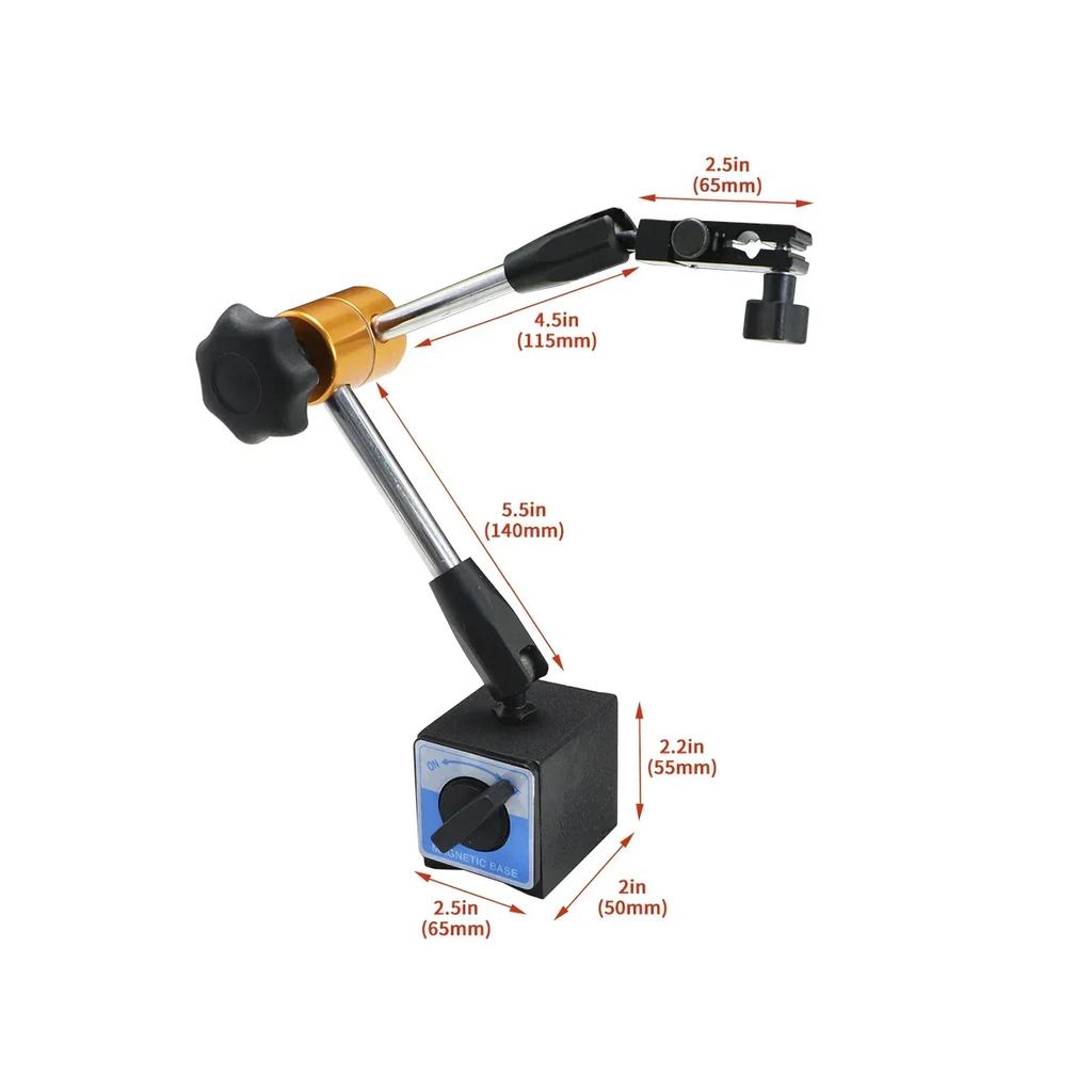 Magnetic stand that uses a switchable permanent magnet for convenient mounting onto flat iron or steel surfaces.The arm can be hydraulically locked in any position using the knob on the upright . Useful for holding dial indicators or dial test indicators during alignment operations.