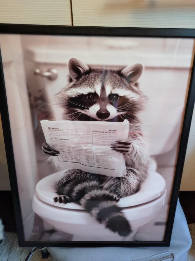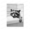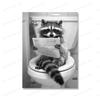 Guaxinim fofo sentado no vaso sanitário escovando os dentes e papel na cabeça pintura em tela pintura divertida banheiro tela fotos decoração