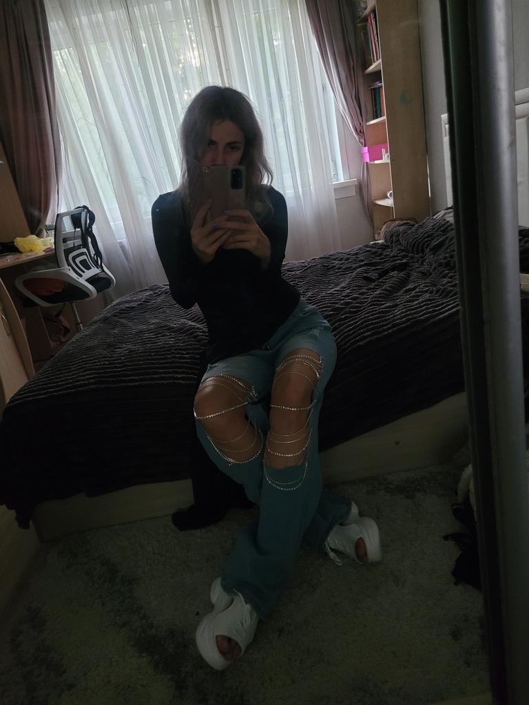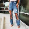 IHUASU Jeans Grandes Rasgados de Início da Primavera Calças de Perna Reta com Corrente Pendurada Femininas