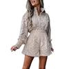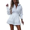 Summer Solid Color Casual 2Pcs/Set Women Outfit Blouse Long Sleeve Single Breasted High Waist Embroidery Hollow Lace Shirt Wide Leg Women Shorts Set