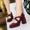 Retro Salto Alto Salto Grosso Plataforma Impermeável Camurça Boca Rasa Bico Quadrado Fivela de Cinto Sapatos Solteiros de Uma Tira Para Mulheres