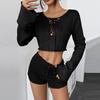 Casual Knit Shorts Suits Women O Neck Long Sleeves Bandage Tops Sets Female 2025 Spring Summer Lady Beach Sets 2 Pieces