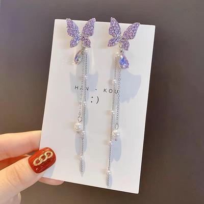 Brinco Pendente Borboleta Roxo Para Mulheres Corrente de Tassel de Pérola