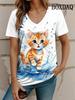 Women's Cat Print T-shirt, Outdoor Harajuku Short-sleeved T-shirt, V-neck Large T-shirt, Women's Animal Clothing
