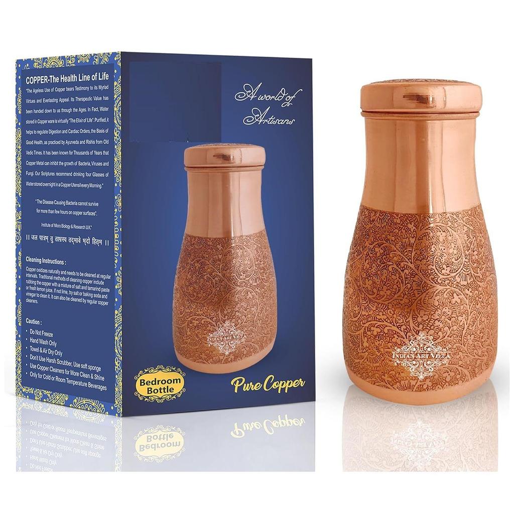 Pure Copper Embossed Design Bedroom Water Bottle with Inbuilt Glass, Bottle for Storage Purposes, Drinkware, 1000 ml- Set of 1