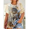 Women's animal T-shirt, cat print casual, round neck short sleeved T-shirt, regular round neck top, summer fashion