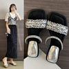 Korean version of cool slippers women's summer wear thick heel fashion rhinestone sandals 2025 new Internet celebrity middle heel one-word drag